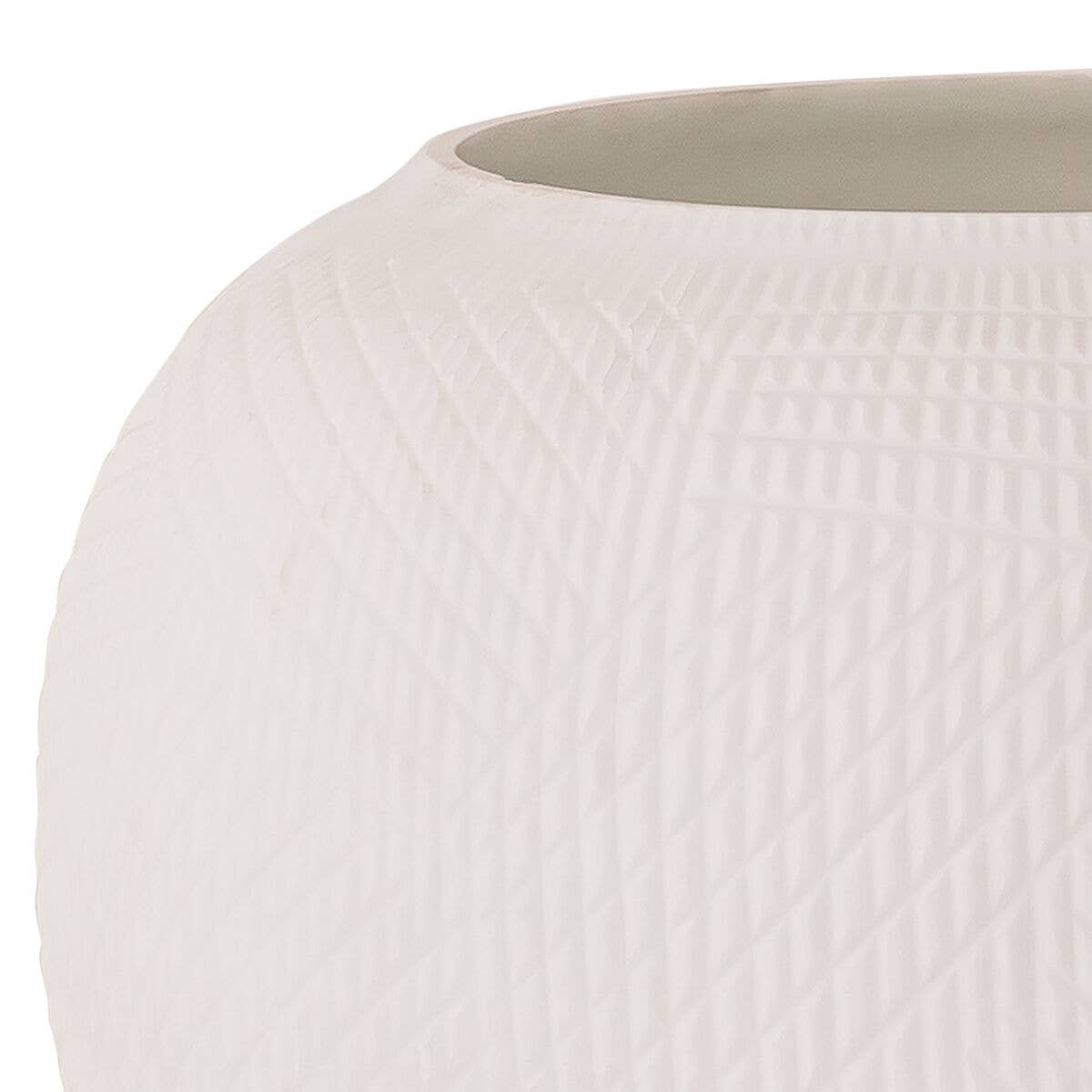 The Besse Vase is a rounded glass vessel with a large mouth opening. The matte white surface is notched in an overlapping geometric pattern.