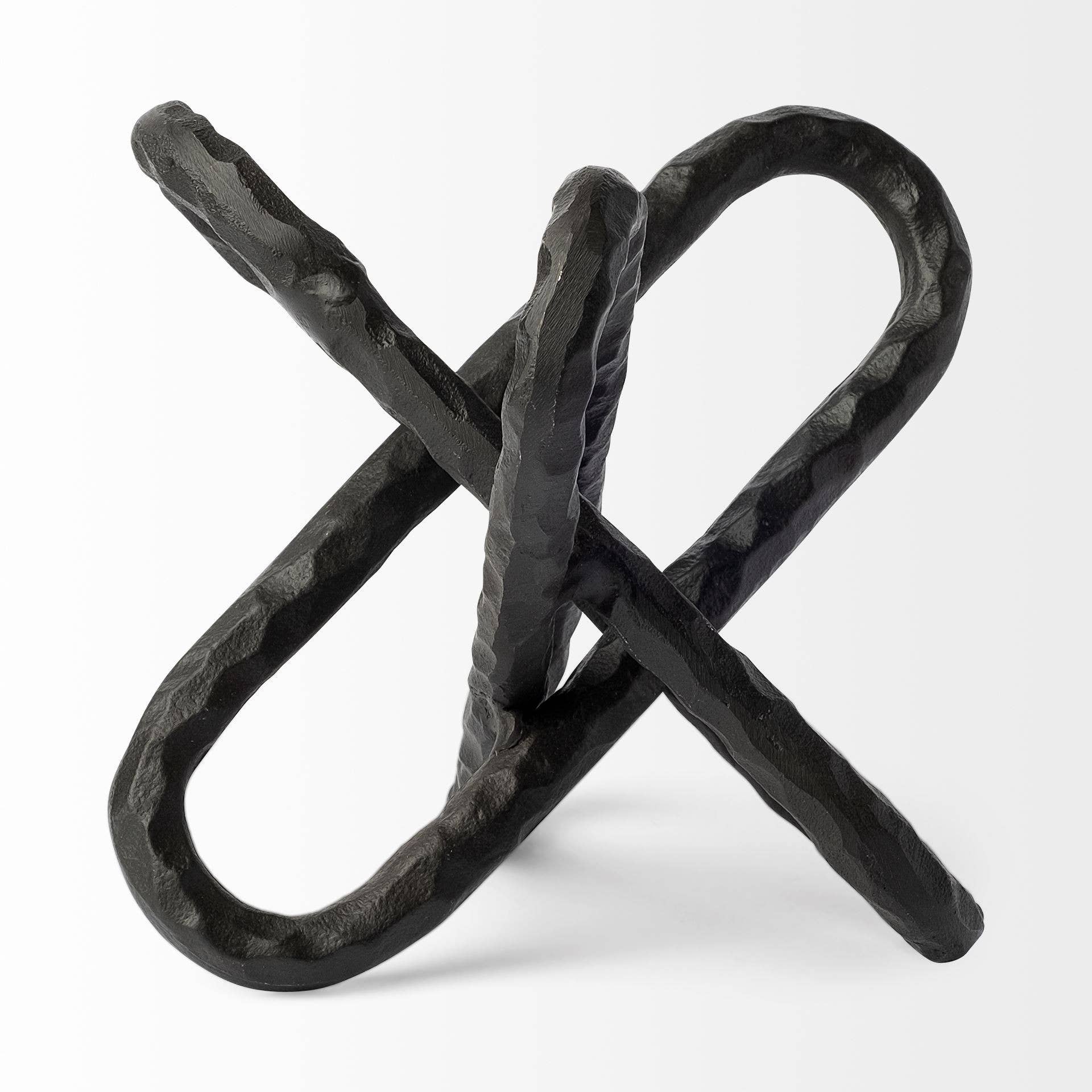 With this Black Textured Metal Chain Link Sculptureyou can add the perfect touch of industrial design to your home. This piece is made from solid metal and has a vintage inspired black finish on top. There are three separate oval metal shapes that intersect to create this 3D chain link shape. These shapes have a loosely hammered design on them which adds texture to this piece. This decor piece will look great in any room in your home owing to its neutral colorway. Display it on your bookshelf, or use it as coffee table decor. 10" H x 10" W x 10" Dhand craftedgreat gift ideaunique design and styling