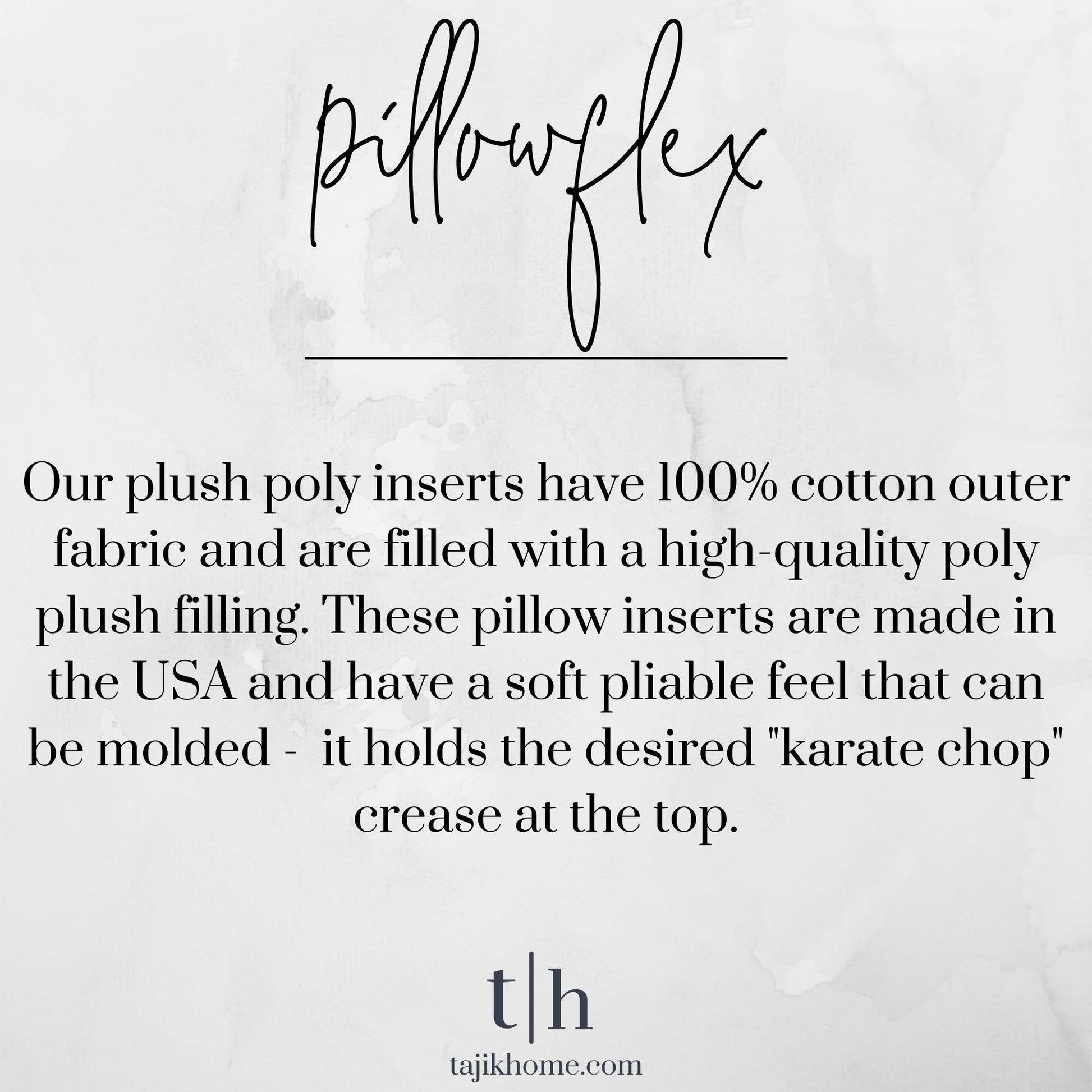 Plush Poly insert is 100% cotton outer fabric and filled with a high-quality poly plush filling. This pillow insert is made in the USA. This pillow insert has a soft pliable feel that can be molded - it holds the desired "karate chop" crease at the top. We take care of upsizing the inserts so you don't have to!