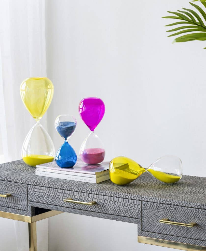 This traditional hourglass has vibrant rose pink sand,so it offers an easy way to add a pop of color to your entryway or home office.Made of pure glass without a cumbersome stand,this minimalist hourglass has smooth,elegant curves.Its versatile size means it can fit anywhere and brighten up a side table,bookcase,or mantel.