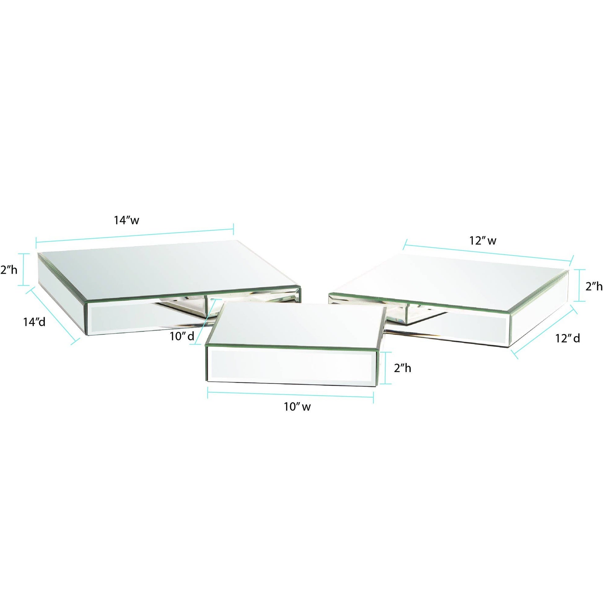 Add some style and modern elegance to your space with the Set of Three Mirrored Rectangular Display Platforms. These exquisite platforms are made from a wooden base covered with inlaid beveled mirrors on each side. The can be used separately to hold and highlight your favorite pictures, plants, candles, and accessories or combine together to make a taller tower to display your most special decor. The boxes can even be stacked themselves as piece of art. A perfect piece for displaying accented home decor on consoles, shelves, dressers, etc. A superb decorative addition that will give your home decor a stylish modern makeover! 2" x 14" x 14"