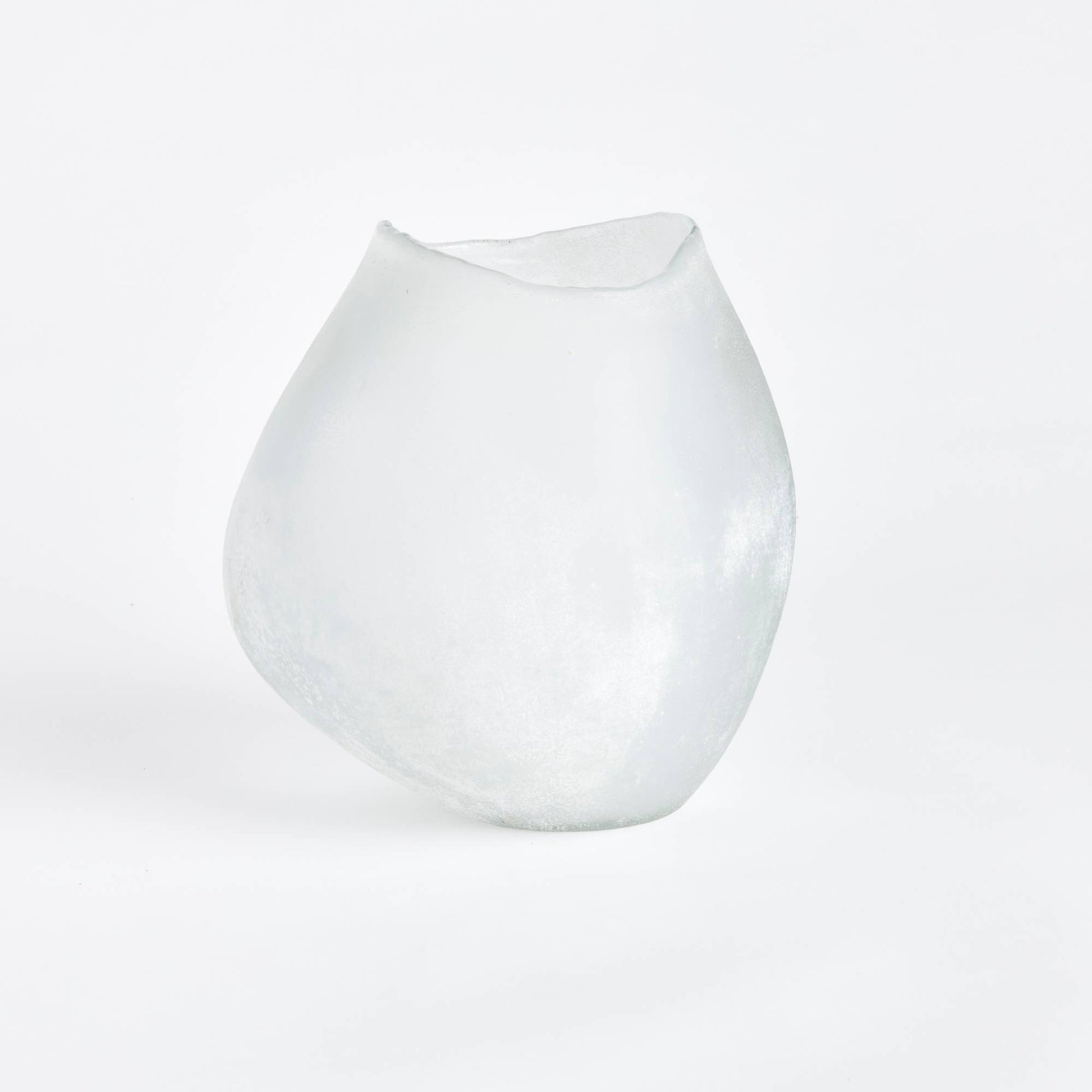 Nature-inspired, this hand blown glass vase has a bulbous shape and melted edge rim detail. The frosted glass only adds to it's appeal. A beautiful addition to bookshelf, mantel or side table.