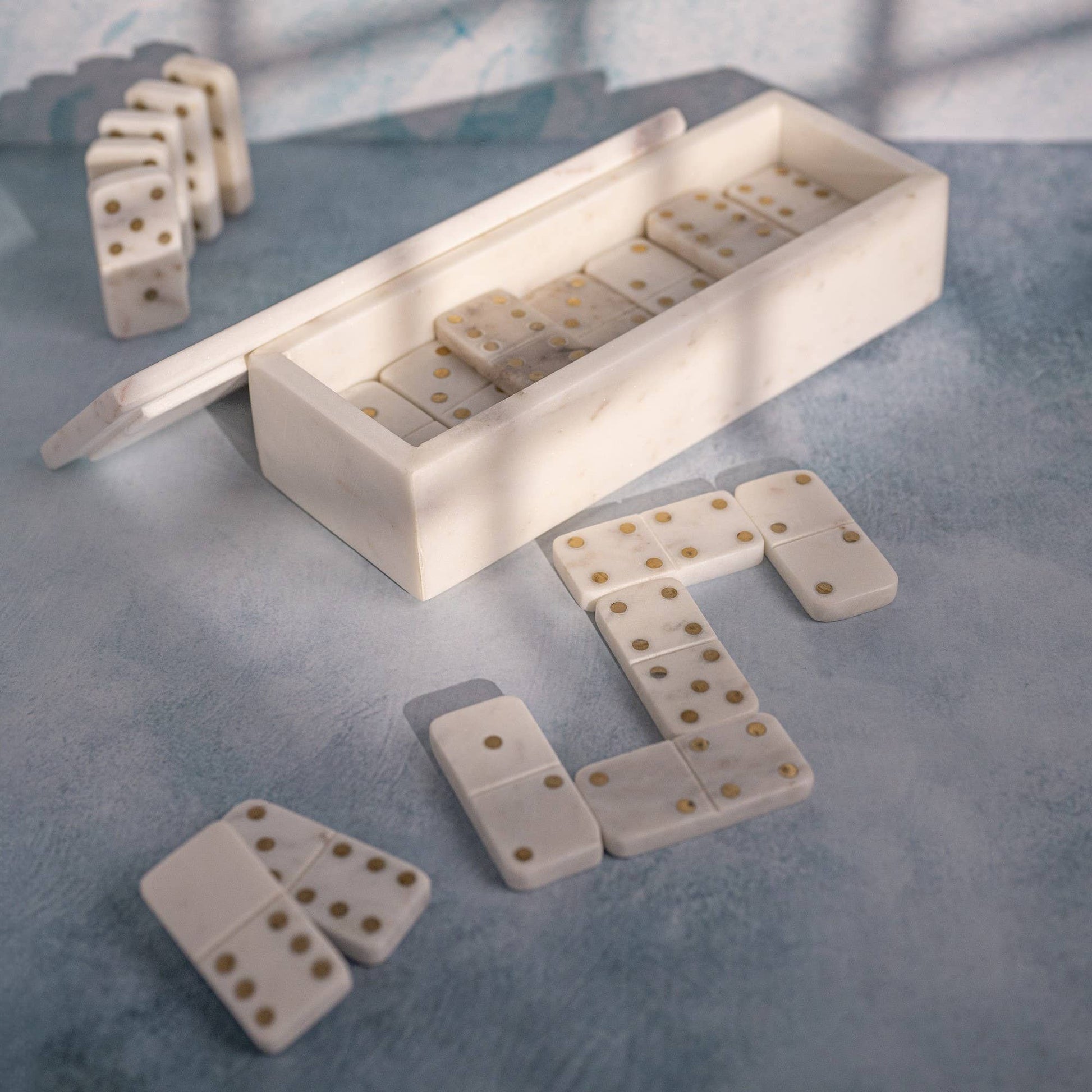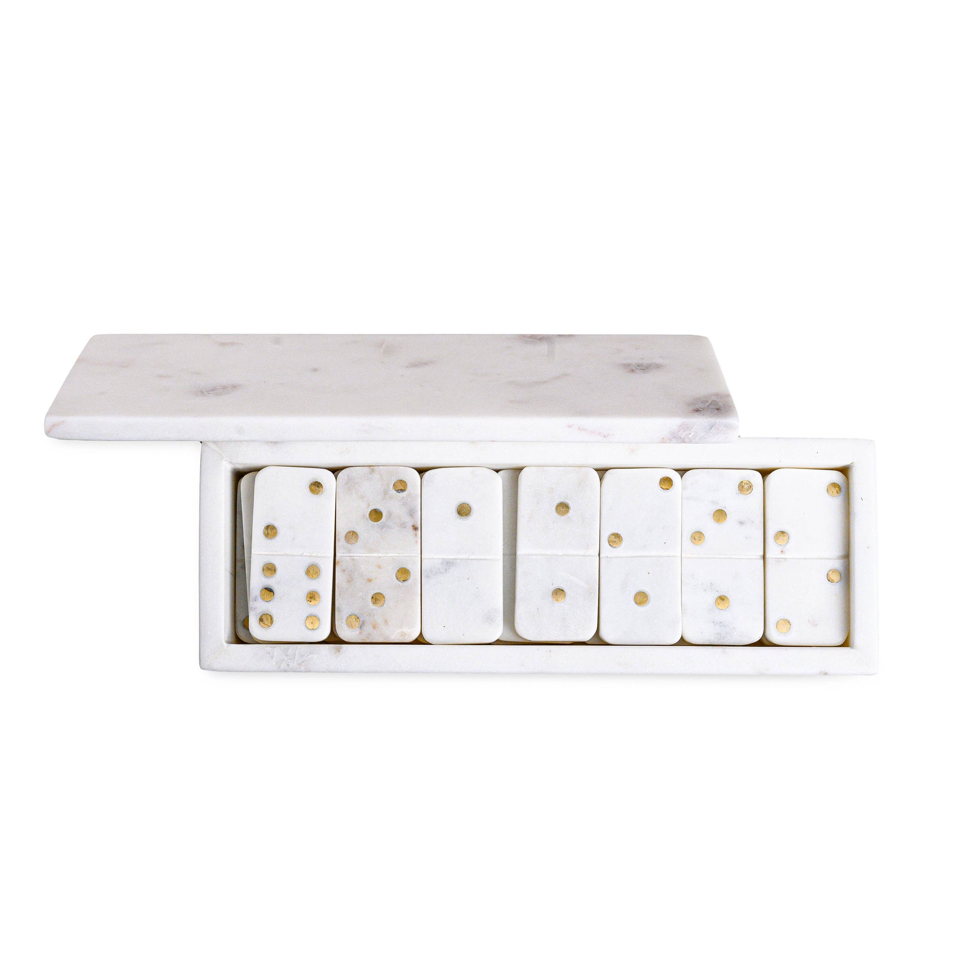 White Marble Dominoes Set W/Brass Dots Inlay: MARBLE & BRASS / White