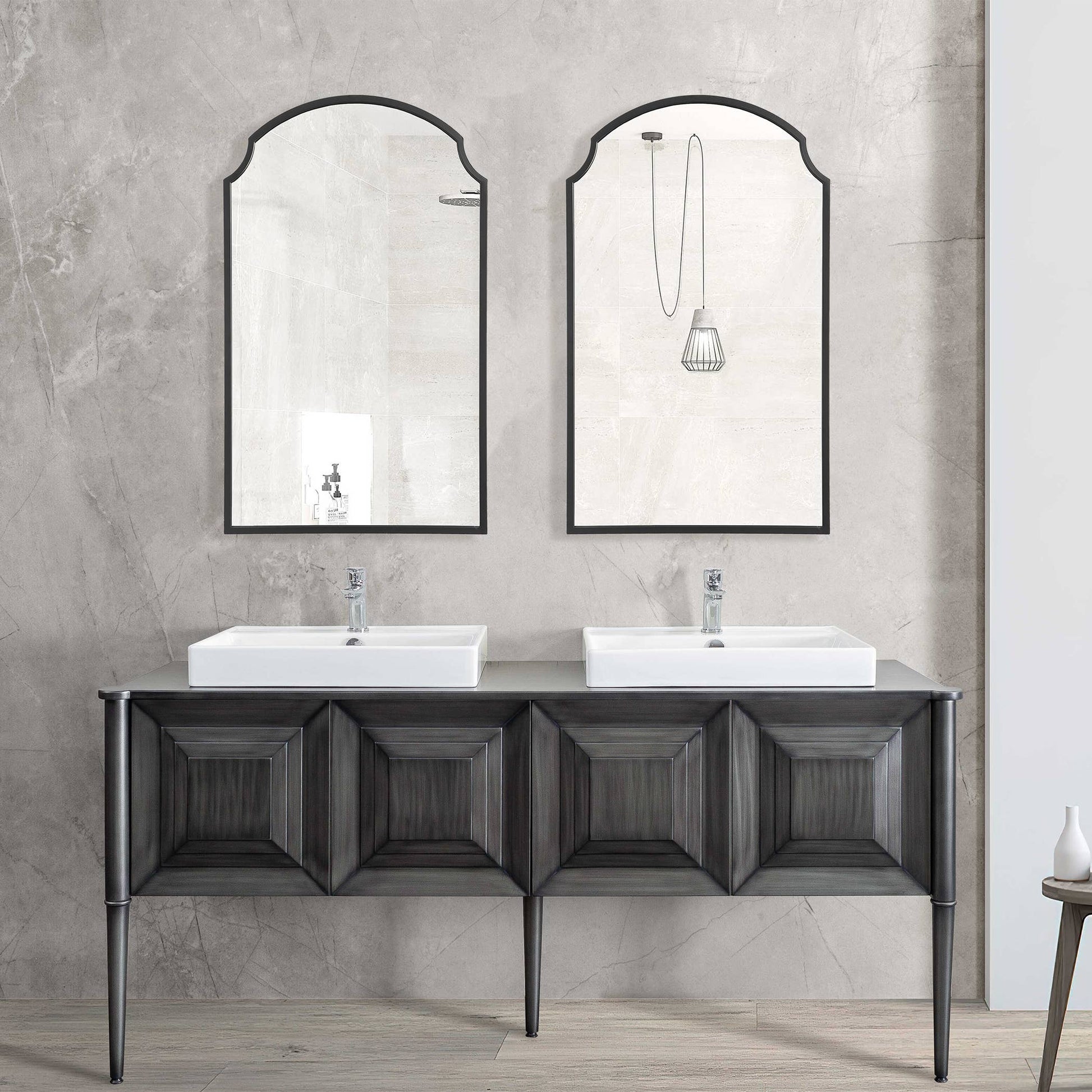 Beautiful arch top metal frame featuring scalloped corners. Finished in a satin black, this frame is a perfect choice for a bathroom vanity or over an accent table in the foyer.